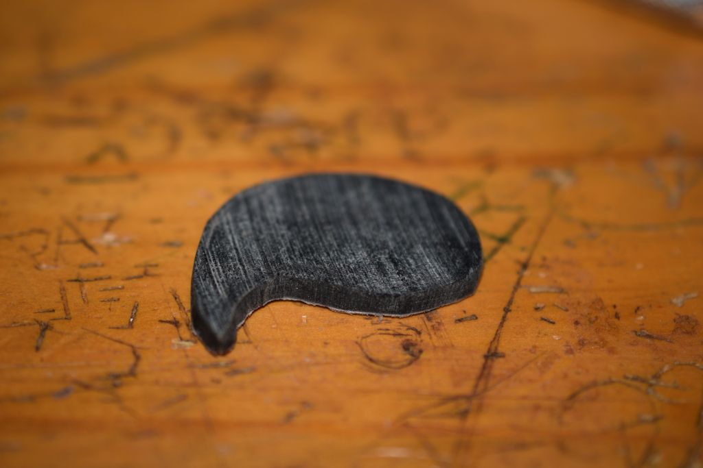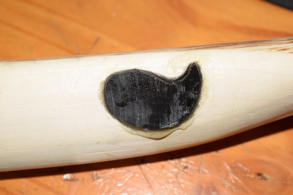 Habe mich zum erstenmal an einem Arrowpass probiert. Das Stück Horn dafür rauszuarbeiten war kein Problem (mitm Bandschleifer), das Einsetzen habe ich aber nicht ganz sauber hingekriegt. Danach habe ich versehentlich an einer Seite etwas zuviel vom Horn weggeschliffen. Hinterher ist mir eingefallen, ich hätte das Epoxy auch einfach mit gerapeltem Horn oder Holz mischen können, dann wärs gar net aufgefallen.