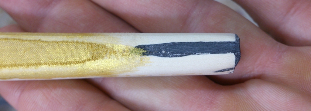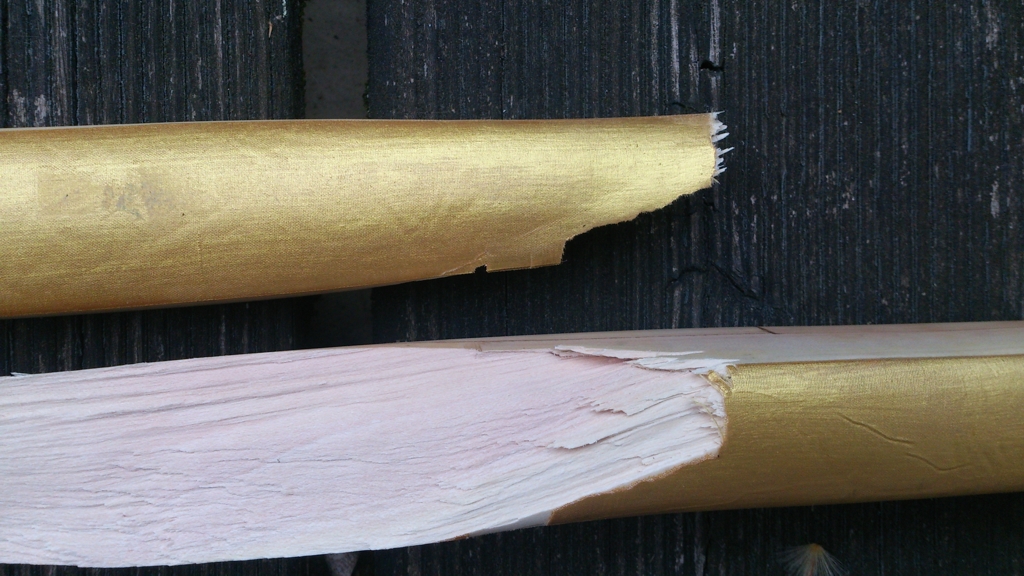 Also hab ich einen Längsschnitt gemacht und Pfeilnock-Verstärkungshorn eingebaut. Aber etwas anders als üblich eingebaut - seht selbst. Das Seidenbacking hab ich mit Ponal Blau und Goldpigmenten eingepinselt.
