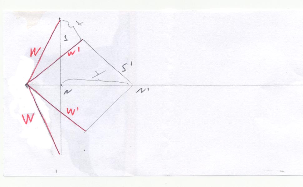 Nun wir ausgezogen: Nun sind „W' “ die Wurfarme nach dem Auszug, „S' “ die Sehne nach dem Auszug und „N' “ der Nockpunkt nach dem Auszug.