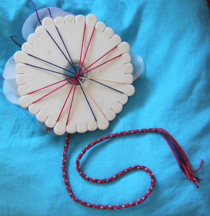Nachdem ich das Befestigungsband für den Köcher geflochten hatte , blieb jetzt noch die Kordel für den Sehnenring der Ersatztbogensehne . Der Sehnenring wurde aus Rattan geflochten, die kordel aus Perlseide ( 16 Fäden ).