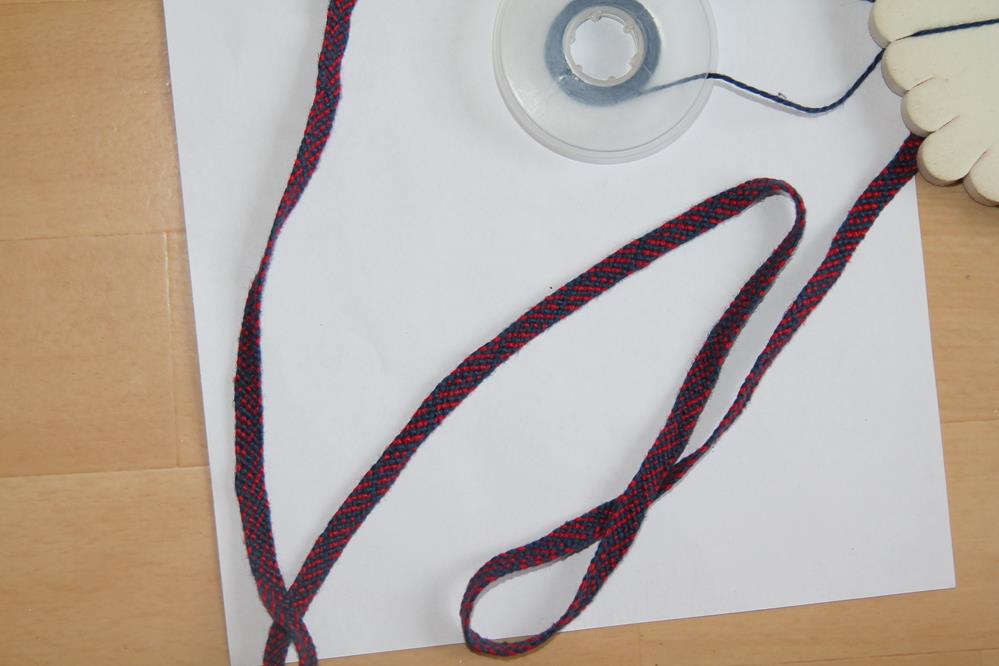 Nachdem ich das Befestigungsband für den Köcher geflochten hatte , blieb jetzt noch die Kordel für den Sehnenring der Ersatztbogensehne . Der Sehnenring wurde aus Rattan geflochten, die kordel aus Perlseide ( 16 Fäden ).