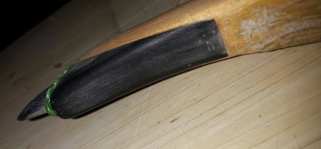 Die Nocke schaut gut aus. Die Sehnenschicht würde ich noch einmal mit Hautleim überziehen und glätten: Mit verdünntem, heißen Hautleim 2-3 mal einpinseln (ist ja vergleichsweise keine Sauerei, sondern Kür) und dann mit Hosengummi Stoß an Stoß umwickeln und nach dem Aushärten (3-4 Tage) mit 180er Papier überschleifen. Damit hat man eine gute Basis für einen blasenfreien Auftrag der Birkenrinde.