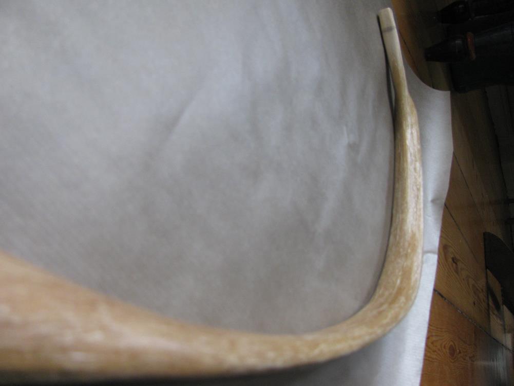 - Eine Sache, die ich bei meinem eigenen Bogen auch nicht richtig gemacht und überhaupt erst vor kurzem verstanden habe, betrifft den Übergang vom Tip zum Kasan, und zwar auf der Bauchseite. Dort müssen die Seitenwände des Tips bis zum Scheitel der Rundung zwischen Tip und Kasan-Bauch fortgeführt werden. Nur so wird sichergestellt, dass die Sehne bei Standhöhe nur an einem knackigen Punkt den Kasan-Bauch touchiert und den Bogen nicht seitlich instabil macht, indem sie sich über einige cm hinweg über diesen Scheitel/Höhepunkt abrollt. Verstehst Du, was ich meine? //Edit: Siehe Foto, ist ein Karpowicz.// Meine Lösung für das Problem waren dann erzwungenermaßen Sehnenbrücken, um die Sehne über den Kasan-Bauch drüber zu heben. Du kannst jetzt noch, meine ich, die Tips nachformen (brauchst auf dem Bauch ja keine Sehnenschicht). Oder aber später auch Sehnenbrücken einsetzen.