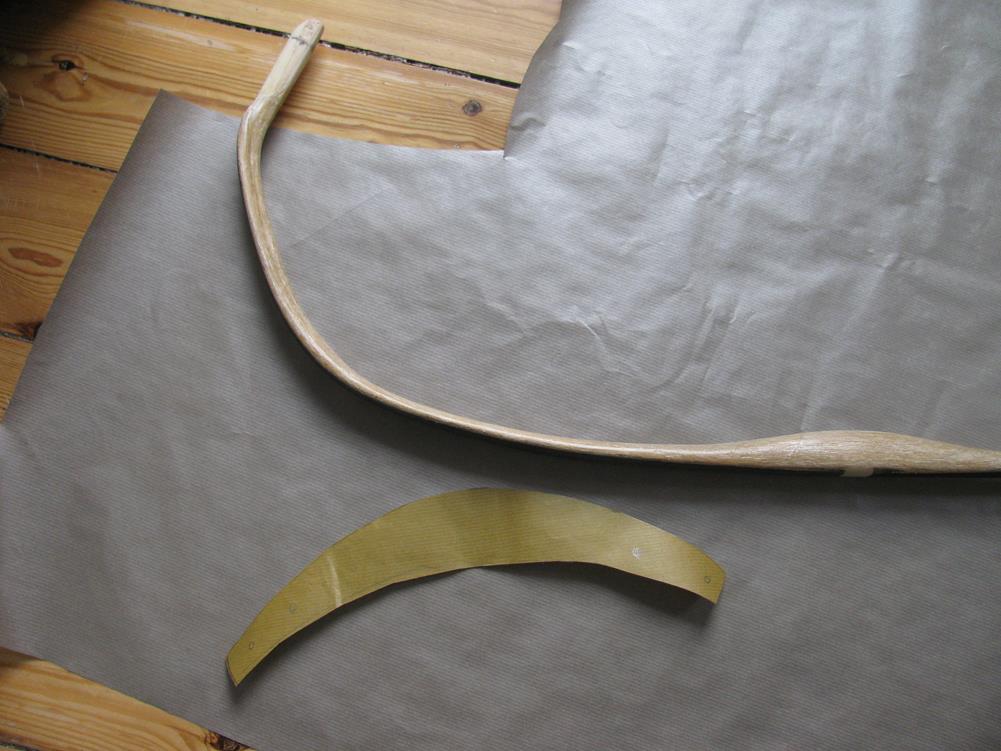 Die überschüssige Sehne auf der bauchseitigen Kante hab ich entfernt und vor kurzem ein asa gezi aus Restholz grob zusammengezimmert. Gestern abend hab ich die Form der Tepeliks entworfen. Meint ihr das passt so? (siehe Foto)