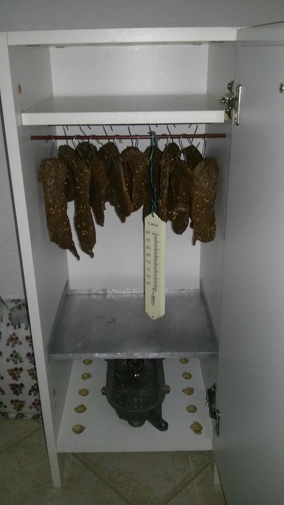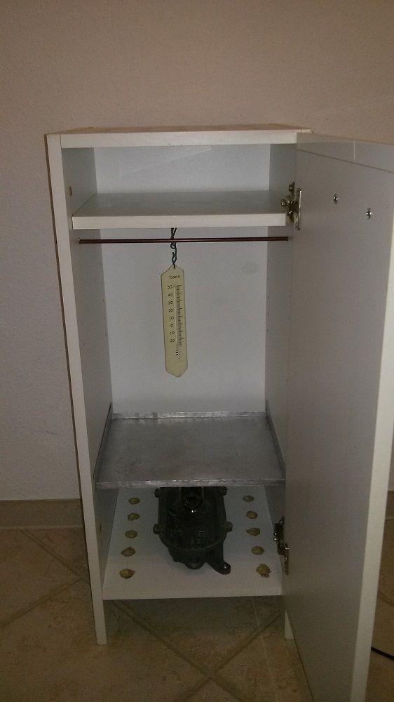 Wenn ich eine Dämmplatte unter den Schrank lege oder etwas hoch stelle wird die Temperatur auch etwas steigen. Saugt jetzt die Luft vom kühlen Fliesenboden an. Als unteren Zwischenboden habe ich der Hitze wegen und als Tropfwanne ein Blech eingebaut. Beide Zwischenböden sind gut 5cm kürzer in der Tiefe so das vorn und hinten ein Zugschacht entsteht.