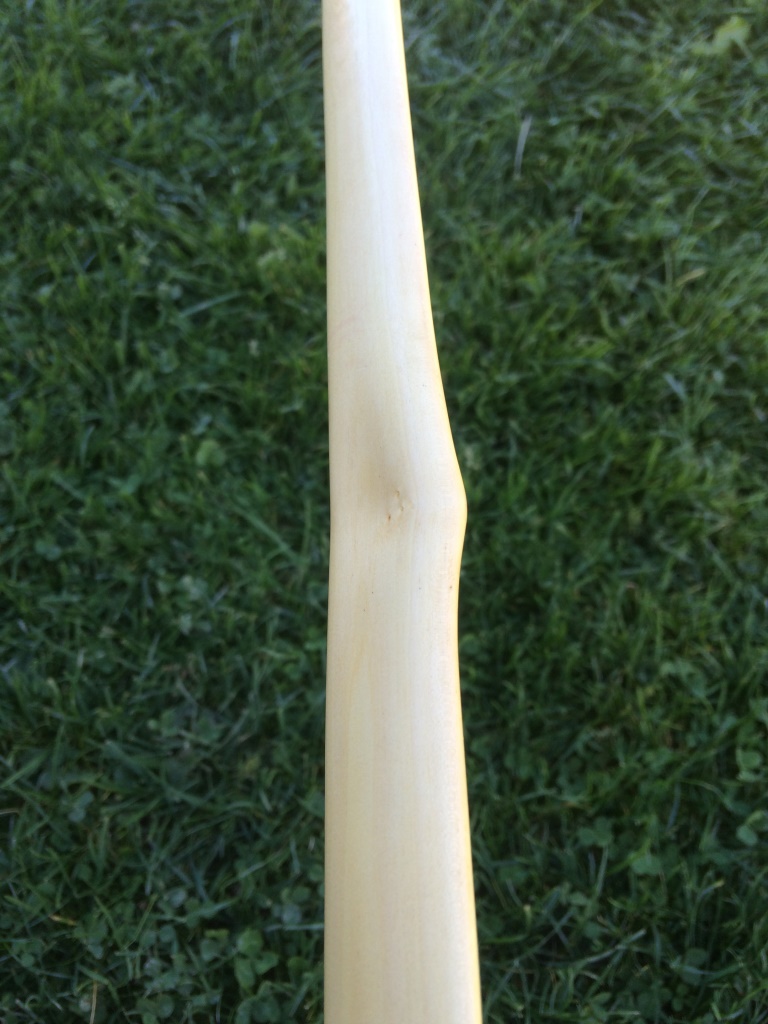 Der Bogen wurde, nachdem ich nur dran gebaut habe, wenn ich arbeitsmäßig auswärts unterwegs war, ausschließlich über die Schulter getillert. Dabei hab ich leider schon früh eine Schachstelle rein gekriegt, die sich leider nicht mehr ganz korrigieren ließ. Den Tillerbaum hat der Bogen nur für die Auszugsbilder gesehen.