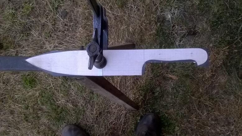 Nächster Arbeitsschritt ist das Anlegen, bzw. das Schleifen der Klinge. Hierfür verwende ich am Bandschleifer eine selbstgebaute Vorrichtung, die es mir erleichtert, den korrekten Winkel zu treffen und zu halten.