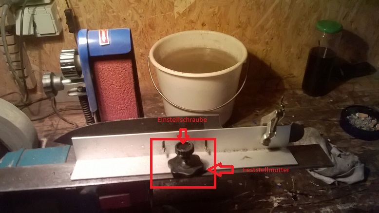 wenn du dir das Bild noch einmal anschaust, siehst du eine Stellschraube an der Vorrichtung. Mit dieser kann ich das Ganze in Richtung Bandschleifer neigen und so den Winkel einstellen.