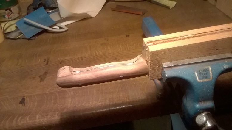Dann kann ich den Griff "im Ganzen" formen, was mir besser gefällt als die einzelnen Griffschalen fertig zu machen und dann aufzukleben.