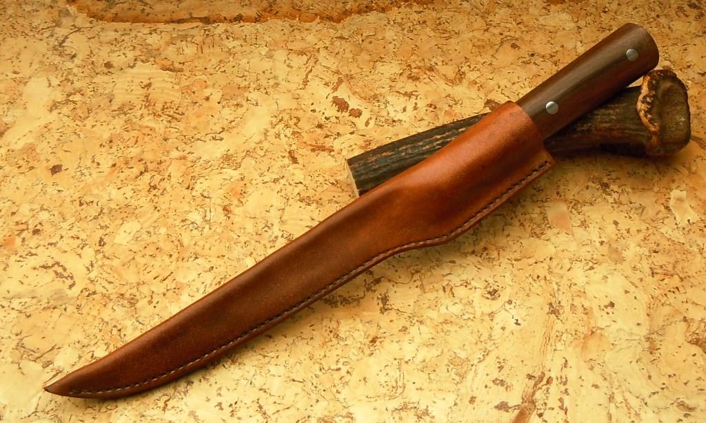 Das Messer ist für einen Freund von mir und wir haben lange über die Dimensionen gesprochen. Er wollte auch eine Scheide dafür haben. Die Scheide ist OK geworden, ich bin mir aber nicht sicher ob sie mir wirklich gefällt. Ich hatte allerdings auch keine andere Idee dazu.