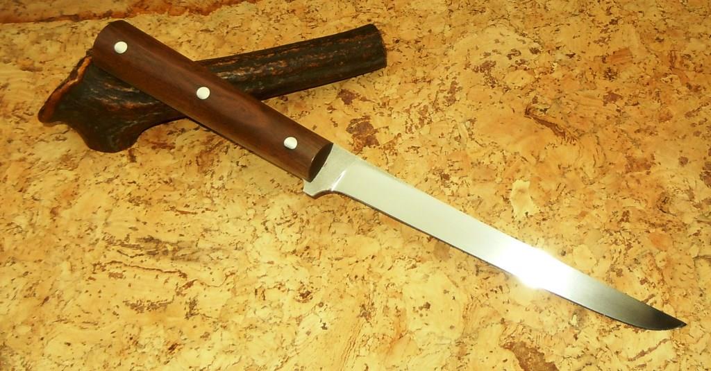 Der Griff ist optisch sehr schön, nur für die Arbeit scheint er mir zu glatt, da würde ich eine Riffelung oder ein Muster bevorzugen, ich bin beim Filetieren von Fisch oder beim Zerlegen von Schwein häufiger abgerutscht weil der Griff von Fett und Blut überzogen war.