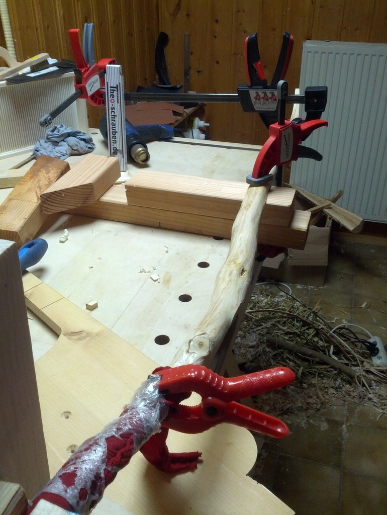 Nach entfernen der Zwingen blieb der größte Teil der Biegung drin. Risse gabs dabei auch keine, nur die kleinen von der Trocknung. Das Biegen geht bei Flieder echt toll, hier nochmal ein Bild des ursprünglichen Stämmchens, der Griffbereich ist nahe der Hausnummer.
