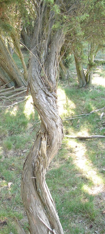 Im Garten und bei diesen Maßen denke ich eher an den hier: https://de.wikipedia.org/wiki/Virginischer_Wacholder Das wiederum ist ein wunderschön gefärbtes und durchaus taugliches Bogenholz.