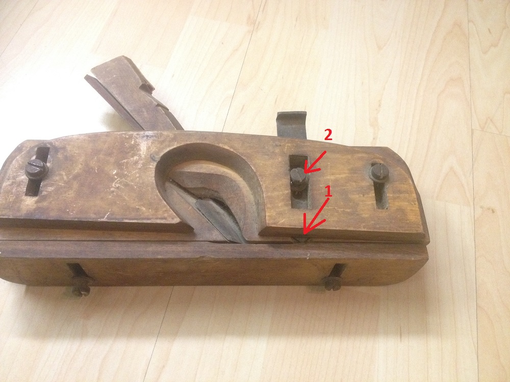 Ich habe in der Scheune von meinem Sohn einen Hobel gefunden, welchen ich keinem Verwendungszweck zuordnen kann. Kann mir hier einer sagen wofür diese Hobel ist und was im Bild die Nase (1) zu sagen hat und was man an (2) demzufolge einstellen kann.