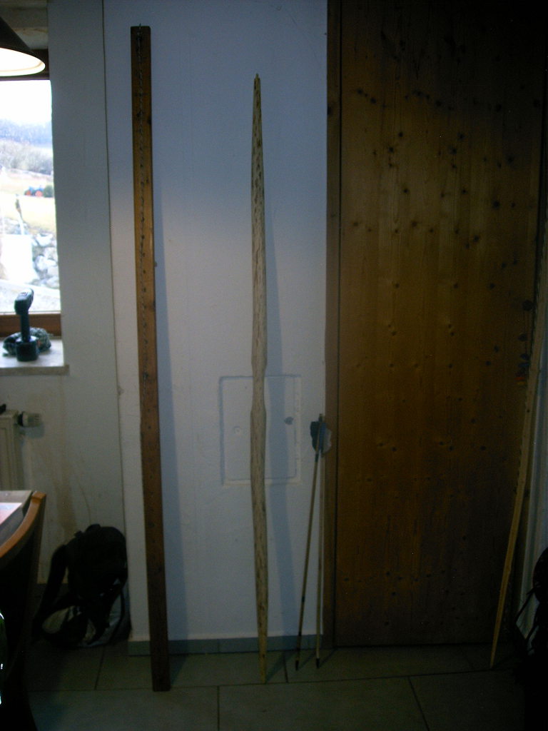 Da dies mein erster Bogen aus echtem Holz ist bekam er den Namen "First Wood" (vorher hatte ich nur 2 Rattanfitschen gebaut). Der eigentliche Stave ist erst vor ca. 1 1/2 Wochen fertiggetrocknet und wartet noch auf seine Fertigstellung. In der Zwischenzeit habe ich aus einem kleineren Stück mit "Charakter" mehr oder minder zum Üben meinen ersten Holzbogen gebaut. Leider ist er auch noch nicht ganz fertig (Griff fehlt, Nocken und Sehnen müssten neu gemacht werden, Tiller hat sich nach erstmaligem langen Aufspannen (8 h) aufspannen direkt vor den Präsifotos noch etwas geändert), aber ich möchte ihn trotzdem mal präsentieren, da ich doch schon viele Stunden Arbeit reingesteckt habe.
