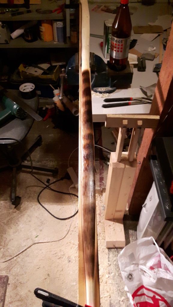 Hab den Hasel heute vom Balken wieder und musste dann leider feststellen, dass ich an den Enden wohl den Rücken mit geröstet habe. Die Hitze wurde wohl vom Balken reflektiert oder sowas. Ich hoffe, dass ich hauptsächlich den Bast verkohlt habe und der Bogenrücken dadurch nicht beschädigt oder geschwächt wurde. Ich hoffe wirklich sehr, dass der Bogen hält. Set ist vollkommen weg, er ist jetzt sogar wieder leicht reflex. Ich weiß natürlich nicht wie das aussieht wenn ich ihn wieder geschossen und nach getillert habe, wäre aber sehr cool wenn er möglichst gerade bleibt.