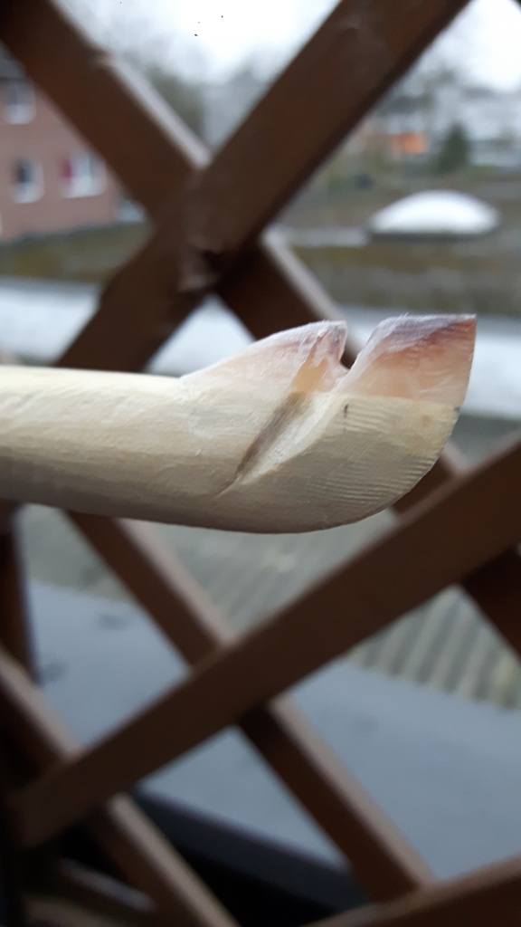Den Tiller werde ich noch etwas nachbearbeiten. Da er schon ziemlich viel Set entwickelt hat, hab ich mir gedacht, ich spann den mal etwas reflex auf ein Balken und temper ihn (inspiriert durch Neumis Hasel). Wenn's ihn die Hose geht, pech gehabt. Noch ein paar Fotos, die wie immer grotig sind. Sollte es zur Präsentation kommen, hole ich die vernünftige Kamera raus. Nochmal tu ich mir son getempere ohne Halterung für die HP nicht an, dass ist echt ka......