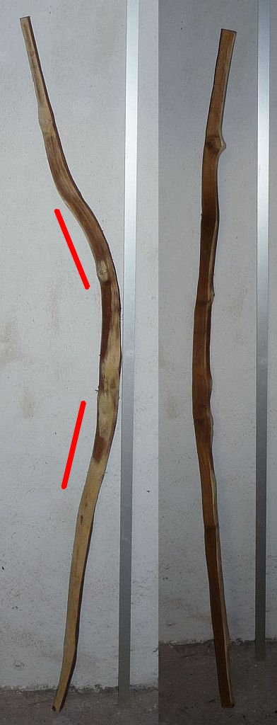 Bogenholz auf Karopapier oder zumindest entlang von eingezeichneten Linien mit Maßstab ausrichten und zwar konsequent Bauch zum Boden plus Rücken zum Boden plus von der Seite links und rechts. Notfalls mit Zwingen oder Wäscheklammern stützen/ ausrichten.