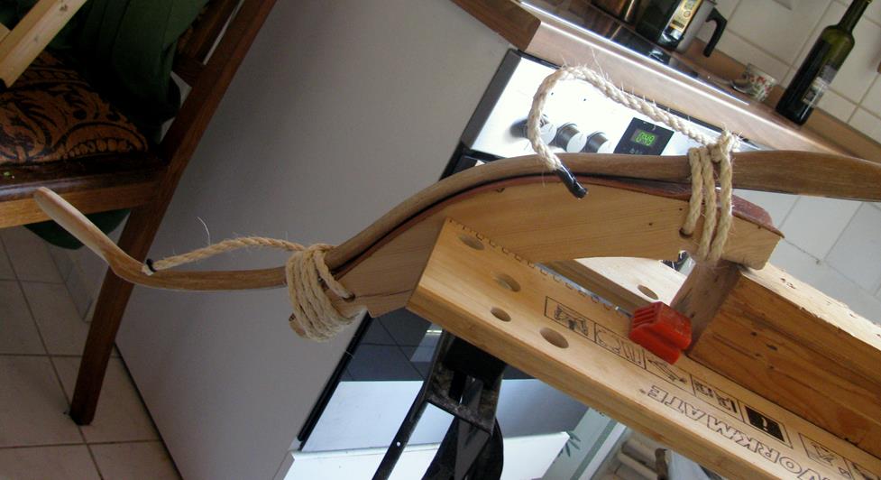 Die Tepeliks würde ich 24 h drauf lassen und die Sehne dann auf den Bogen mitsamt Tepeliks über eine Aufspannhilfe einhängen.