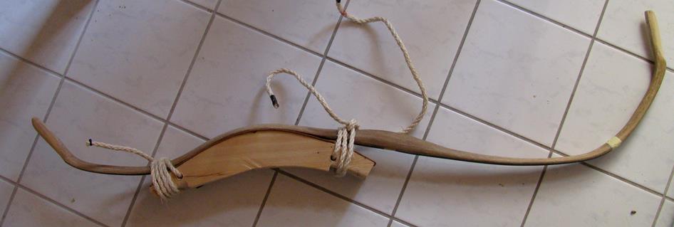 Dass er noch ganz ist, ist schon mal geil. Allerdings hat sich eine Baustelle in der Sehnenschicht aufgetan. Mitten im Biegebereich ging da ein feiner Querschnitt durch die obere Sehnenschicht. Ich vermute das ist passiert als mir der Bogen während der Trocknungsphase einmal runtergefallen ist. Ein paar Fasern haben sich abgehoben und die habe ich nach Entfernen der Tepeliks abgezogen. Da muss also ein bisschen neue Sehne drauf. Eigentlich kein Problem, aber die muss natürlch trocknen.