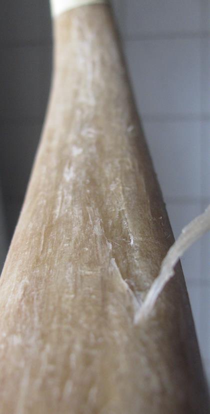 Trotzdem konnte ich links und rechts davon eine hauchdünne Sehnenschicht, ca 5mm breit und ein paar cm lang ziemlich leicht abheben und abziehen. Diese dünne Schicht hatte kaum Haftung. es scheint so, als fehlte dort auch Leim. Durch die von den Tepeliks verursachte Dehnung hat sich diese Schicht dann vermutlich weiter gelöst. Nun hab ich mittig auf dem Wurfarm eine längliche Mulde in der Sehnenschicht, die ich auf jeden Fall füllen muss denke ich.