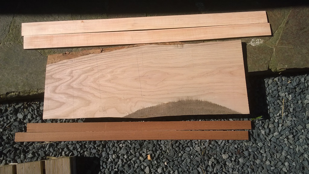 Zur verfügung hätte ich ein Eschebrett für den Rücken, ein mir nicht bekanntes Tropenholz und Sipo Mahganoni. Alles noch nicht zugesägt und gehobelt da ich mir über die Dimensionen noch nicht klar bin. An Furnier hätte ich noch Rigelesche hier mit ca. 1mm.
