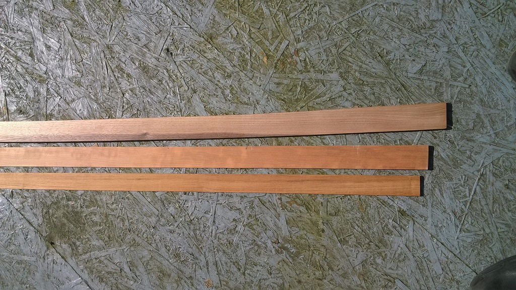 Unten - Teak, 4,5 breit, 185cm lang, 5mm dick (vermutlich nicht brauchbar, gefiel mir aber :))