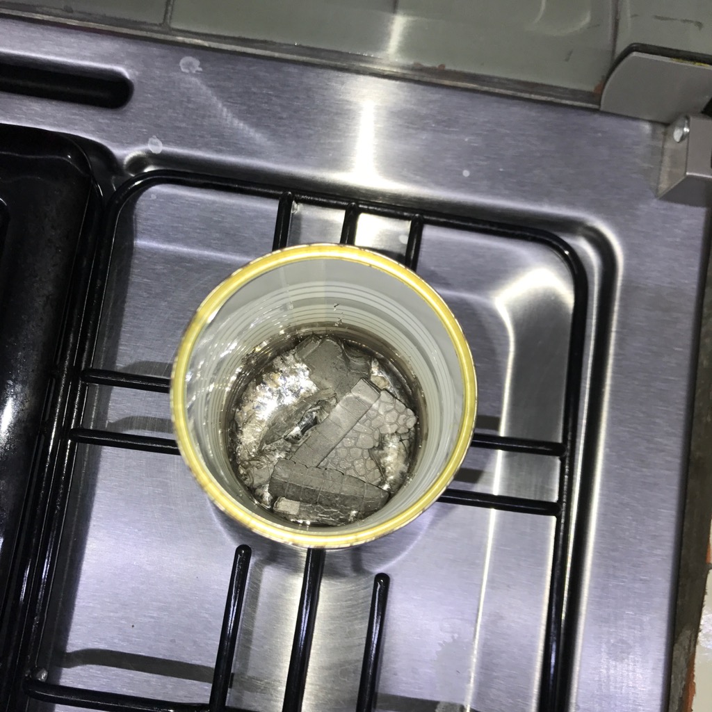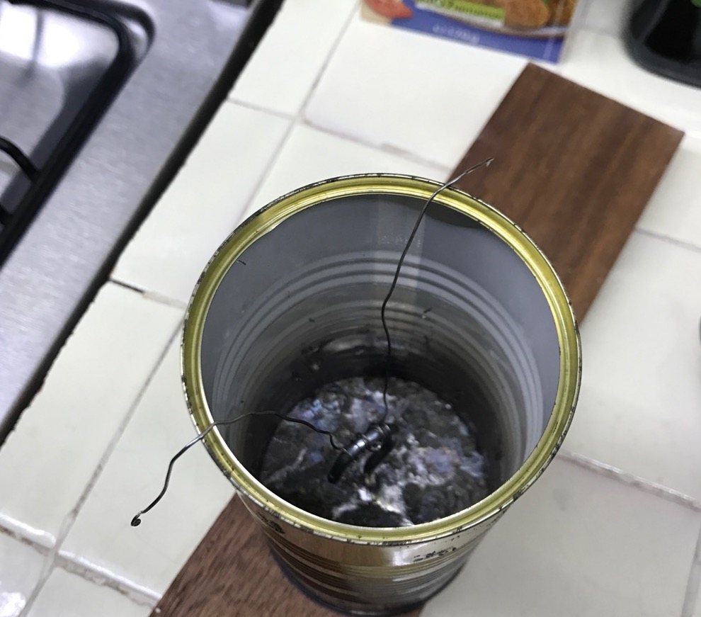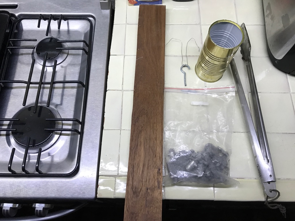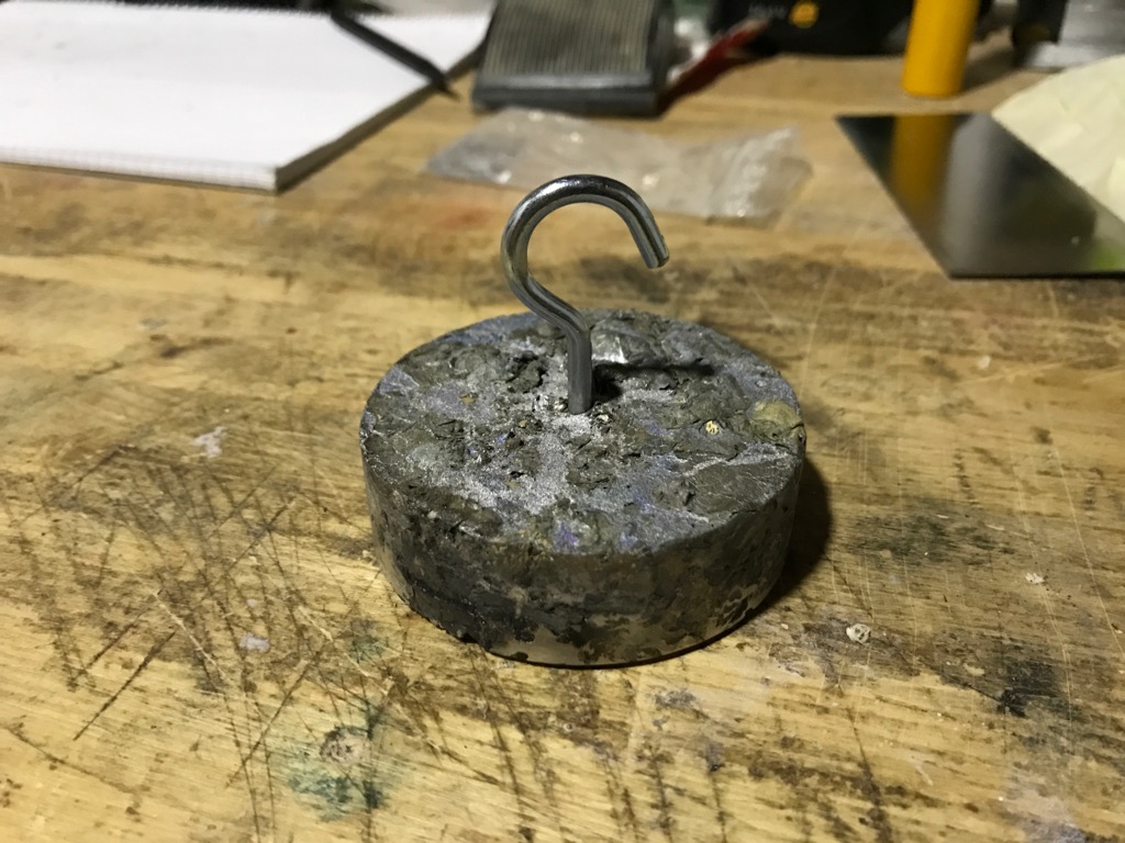 Zunächst habe ich mich an das 2lbs-Gewicht gemacht. Erfreulicher Weise hatte ich aus Tabletop-Jugendverschwend-Zeiten einen Beutel mit Zinnminiaturen übrig behalten, die erst auf 2lbs abgewogen und dann eingeschmolzen wurden: Cleverer Weise hatte ich das Eigengewicht des Hakens nicht auf dem Schirm, d'oh. Das gab mir die Gelegenheit, die etwas raue Oberseite des Gewichts mit der Feile zu bearbeiten, bis wir wieder bei 2lbs waren.