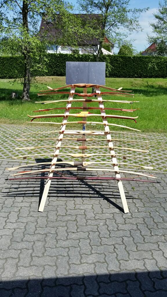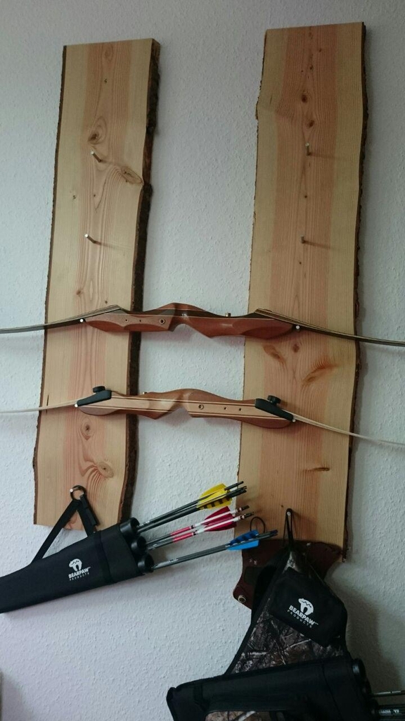 Ich hab mir nur fuer die Werkstatt aus Rumfortbrettern eine Art Besenschrank gebaut und obendrin ein paar Pfeilreste in die Rueckwand geduebelt. Bogen mit der Sehne druebergehaengt, fertig.