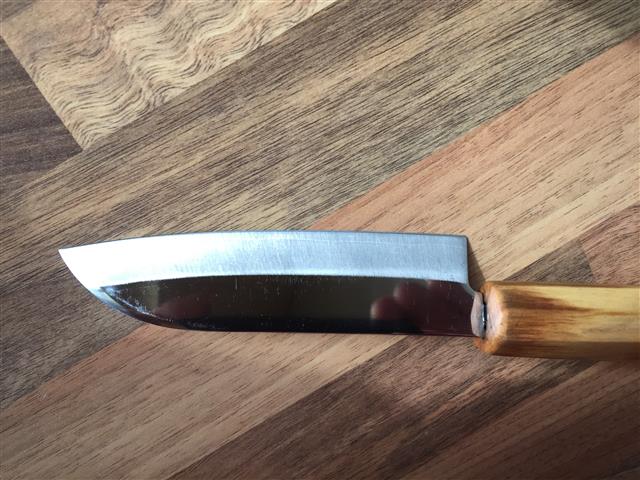 Bin eigentlich sehr zufrieden, hatte erst Sorge, das ich die Härte nicht erreicht habe beim Erhitzen mit dem Gasbrenner, aber scheint zu passen, lässt sich gut schärfen (zum Rasieren und Tomatenschneiden reicht es allemal