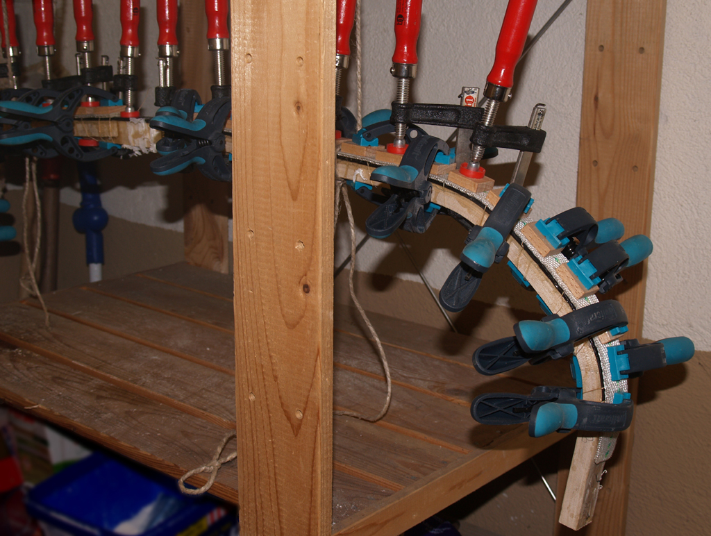 WA- Biegen: Das ofengetrocknete Holz wurde zunächst 10 Tage lang in kaltem Wasser eingeweicht, bei zweimaliger Desinfektion der Oberfläche mit kochendem Wasser bzw. Wasserstoffperoxid 0,2%ig. Es wurde dann in der Dampfkammer 50min bei 98°C erhitzt und dann nach der Thonet-Methode auf der Schablone gebogen. Bei der Thonet-Methode wird im späteren Bauchbereich ein Stahlband sehr fest an den Holzenden angeklemmt. Beim Biegen nimmt dann das Stahlband die gesamte Zugkraft auf, die neutrale Fase liegt zwischen Holz und Stahlband. Das Holz bekommt so nur Druck (Stauchung) ab, was es bei dieser Dicke besser aushält als Zug. Das Verfahren ist seit langem ein bewährtes industrielles Verfahren z.B. für Möbel. Nach dem Biegen ließ ich die WA´s abkühlen und habe dann die Stahlbänder innerhalb weniger Sekunden entnommen und die WA´s wieder auf der Schablone festgespannt, das Ganze muss schrittweise gehen damit das gebogene Holz sich nicht zurückbewegt. In diesem Zustand ließ ich die WA´s trocknen.