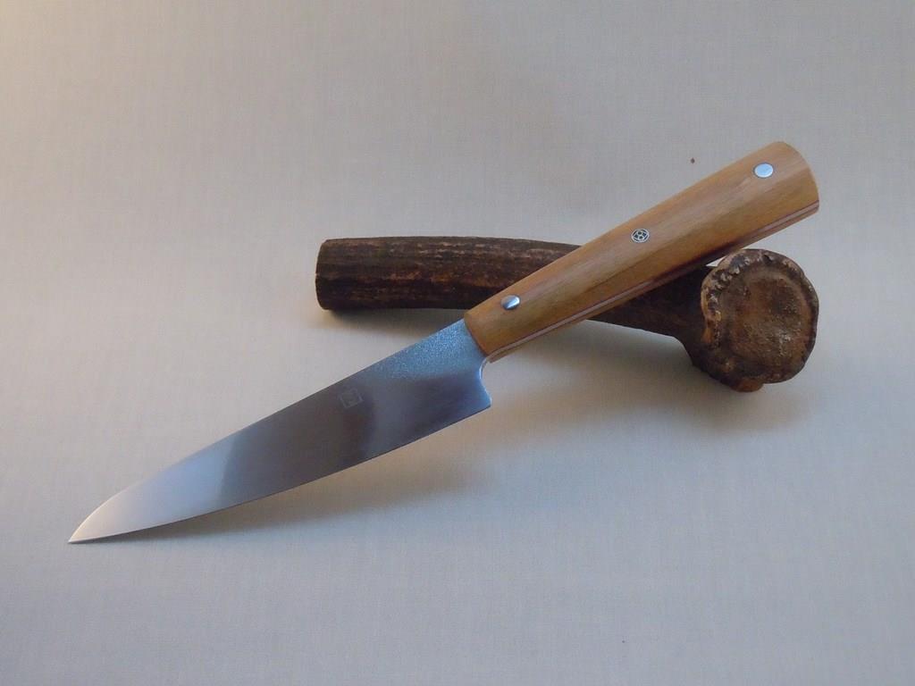 Hier wieder mal ein Küchenmesser (#48) von mir. Mittlerweile habe ich dieses Messer in Abwandlungen schon zum 6. Mal gebaut, scheint wohl eine beliebte Form und Größe zu sein. Es ist ein Geschenk für einen Freund meines Sohnes. Ich habe jetzt eine Webseite und er ist Webentwickler und hat mir mehr oder weniger meine Seite gebaut.