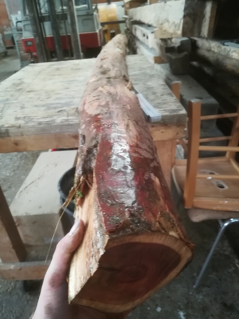 Ich habe heute einen Eibenstamm bekommen und mochte diesen Spalten und anschließend zum Trocknen Lagern. Nun zum Stamm, er ist ca. 2,20m lang wobei die nutzlänge kürzer sein wird, je nachdem was für einen Bogen ich daraus bauen will. Stammdurchmesser ist im Durchschnitt 13cm (12cm und 14cm) er hat für eine Eibe wenige kleinere Äste und hat einen leichten Bogen.. Die Jahresringe sind würde ich mal behaupten relativ eng.