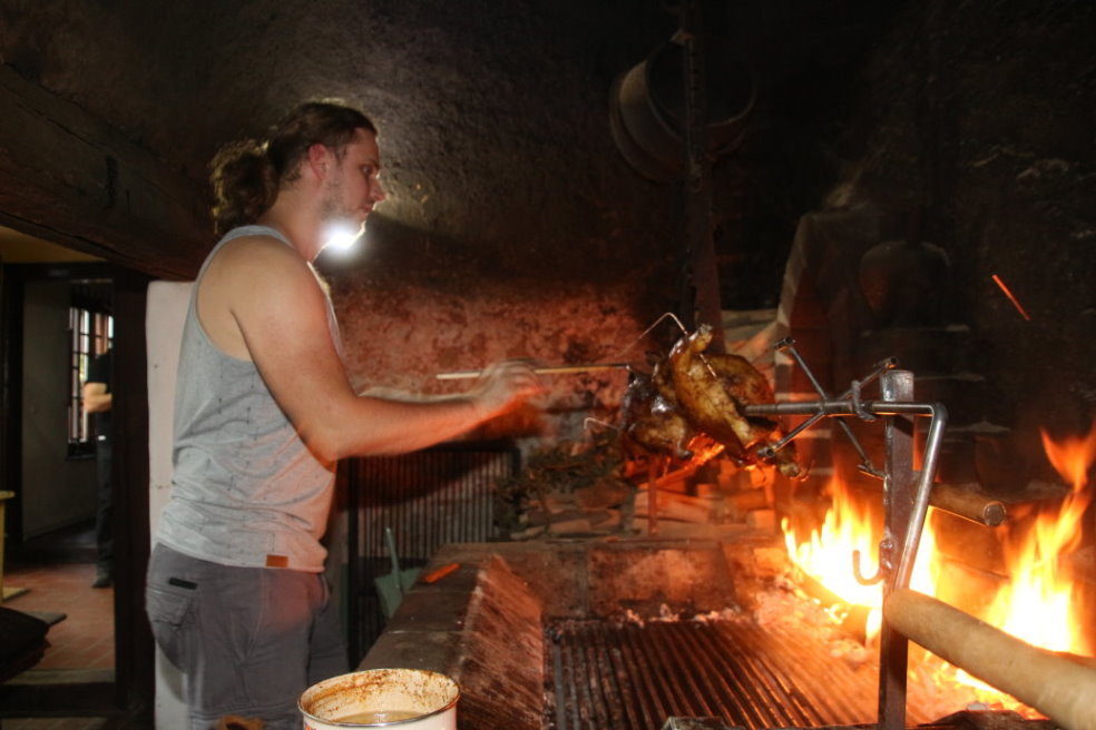 Zwei je 4 Kg Hühner verarztet und auf dem Spieß fixiert, dann schön gesalbt und in die Sonne gestellt zum Aufwärmen. Damit sie keinen Sonnenbrand bekommen werden sie von jedem ab und an gewendet