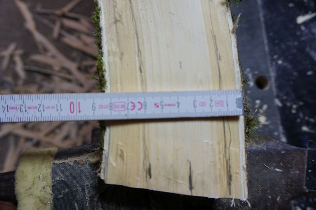 Die Rinde und den Bast habe ich mit der Spachtel entfernt. Das ging besser wie dachte, aber es kam auch erstaunlich viel Wasser zu Tage. Hätte ich bei dieser Jahreszeit nicht gedacht. Nachdem ich die Dicke reduzierte, hat der Reflex noch zu genommen. Ich hoffe mal, dass er beim Trocknen nicht noch mehr zunimmt. Um dies zu garantieren, habe ich den Sap aufgespannt. Nun darf er trocknen ;)
