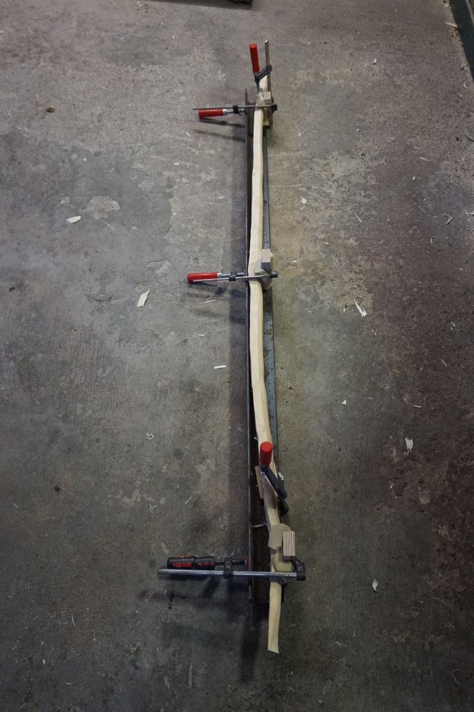 Heute war die Schlehe dran, dass wird auch kein einfaches Stück. Erst habe ich den Sap aufgesägt (nur weil ich keine Zeit hatte)den Rest habe ich von Hand gemacht. Er wurde in der Dicke bis auf den Markkanal reduziert, sodass im Griff noch 2cm stehen geblieben sind. Der Kern ist ein Traum, aber leider fällt das Meiste davon weg. Auf vollen 200cm liegt die Sehne leicht neben dem Griff und ab 165cm wäre alles im Grünen. Ich wollte aber nicht so viel Nachrichten müssen und habe ihn gegensätzlich aufgespannt. Mal sehen ob mein Plan aufgeht und ihn auf 175cm komme ;) So darf er nun trocknen und ich hoffe sie reißt mir nicht!