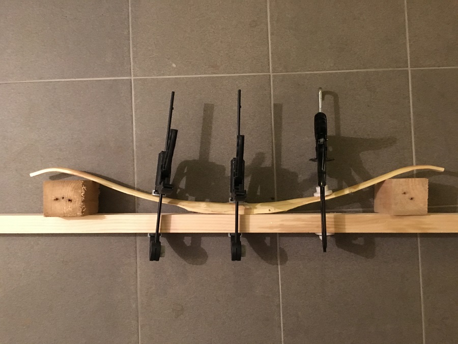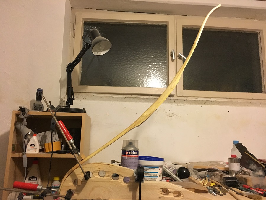 Da hast Du normalerweise natürlich recht. Aber das hier ist nur der Vorbogen des geplanten Penobscot-Bogens. Das Teil ist gerade mal 90cm lang. Die Enden sind so geformt, weil die Kabel zum Hauptbogen über den Rücken des Vorbogens laufen sollen. Daher liegt er auch nicht mit dem Rücken, sondern mit der Bauchseite auf den Klötzen auf - und da kommt eh noch Holz weg.