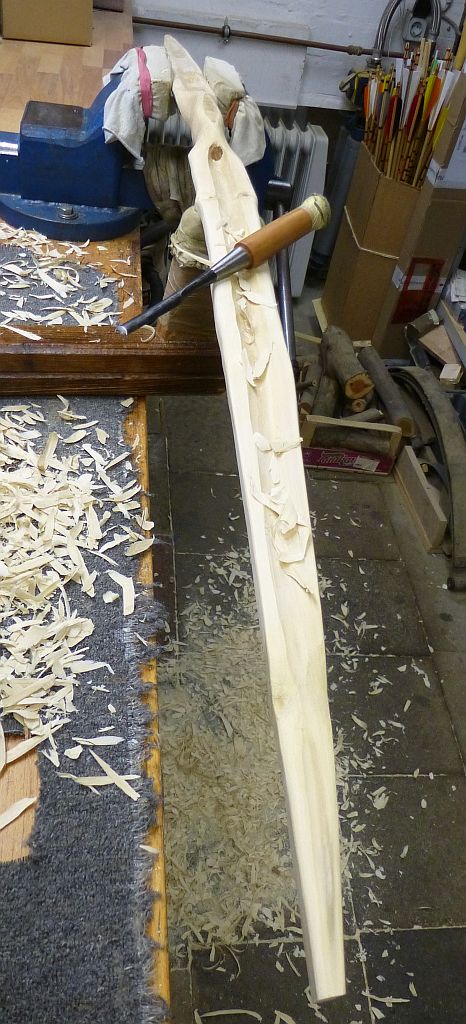 Dann mit dem Ziehmesser auf den Markkanal heruntergearbeitet, der Griffbereich ist noch unangetastet