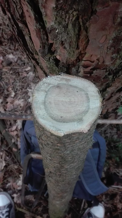 zum ersten Mal überhaupt habe ich einen Baum seines Holzes beraubt. Da ich normalerweise nur Saplingbows aus herumliegenden Ästen und Sprösslingen mache, die ich dann vom Boden scavange, weil ich irgendwie Berührungsängste habe, einen Baum zu fällen "nur" für ein Paar Bögen, hat sich mir diesmal eine exklusive Gelegenheit geboten. Bei uns im nahegelegenen Wald ist ein Baum (wahrscheinlich durch Wind) komplett entwurzelt worden und lag auf dem Boden. Sein Stamm wies einige schöne Abschnitte auf und so entnahm ich ihm einen etwas kürzeren (Armbrustbögen) und einen etwas längeren (Bögen).