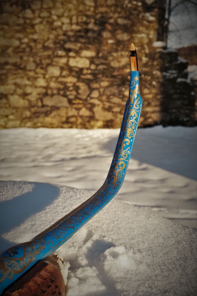 , mit Pinsel und Farbe alles was nicht Silber oder Gold werden sollte wieder blau einzufärben. Der Bogen hat etwas an Zuggewicht zugelegt, was mich überraschte. Er hat nun die Stärke wie vor dem tillern. Nun zu den Daten: