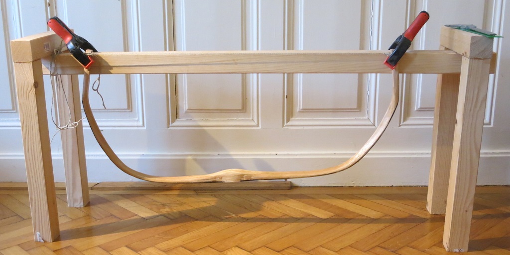 Zuerst packst du aber noch eine Sehnenlage auf jeden Wurfarm drauf, ca. 1 mm Dicke. Dann feucht in den Rahmen, warm und trocken stellen und jeden Tag die Wurfarme lockern, nachgeben lassen und symmetrisch festspannen. Somit rücken sie langsam zueinander, Tag für Tag.