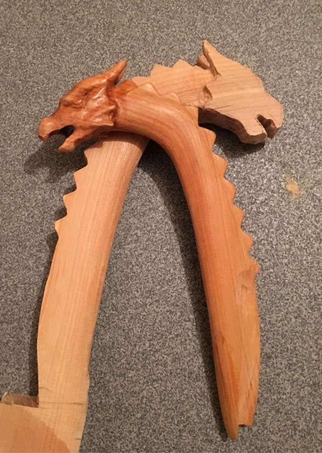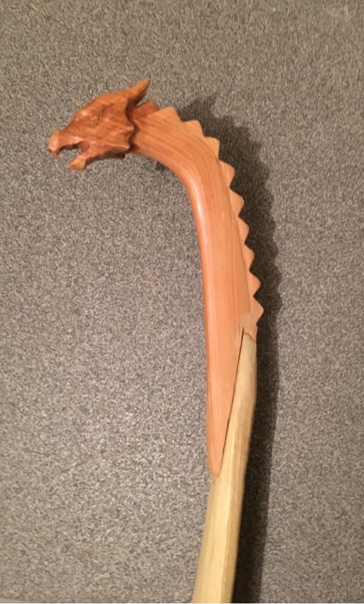 Eine Drachenkopf-Siyah für Robinie 2 ist soweit vorbereitet, dass ich sie einspleißen kann. Auf den Fotos ist Alles nur zusammengesteckt, muss also natürlich noch eineuliert und verschliffen werden. Das mach ich aber erst, wenn die zweite soweit fertig und das Horninlay im Maul eingepasst ist.