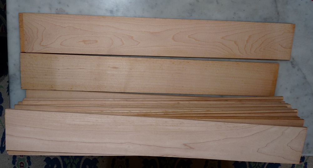 Da ich gestern so gefrustet war , bin ich heute nochmals ins Laubholzsägewerk gefahren. Da habe ich eine 5 Jahre , luftgetrocknete , 2m lange Spitzahornbohle erstanden. Ich musste zwar was hinblättern, aber dafür habe ich eine nahezu astfreie Bohle mit liegenden Ringen bekommen. Daraus konnte ich 14 Rahmen heraus schneiden und 9 Griffe. Nun kann es losgehen ;D