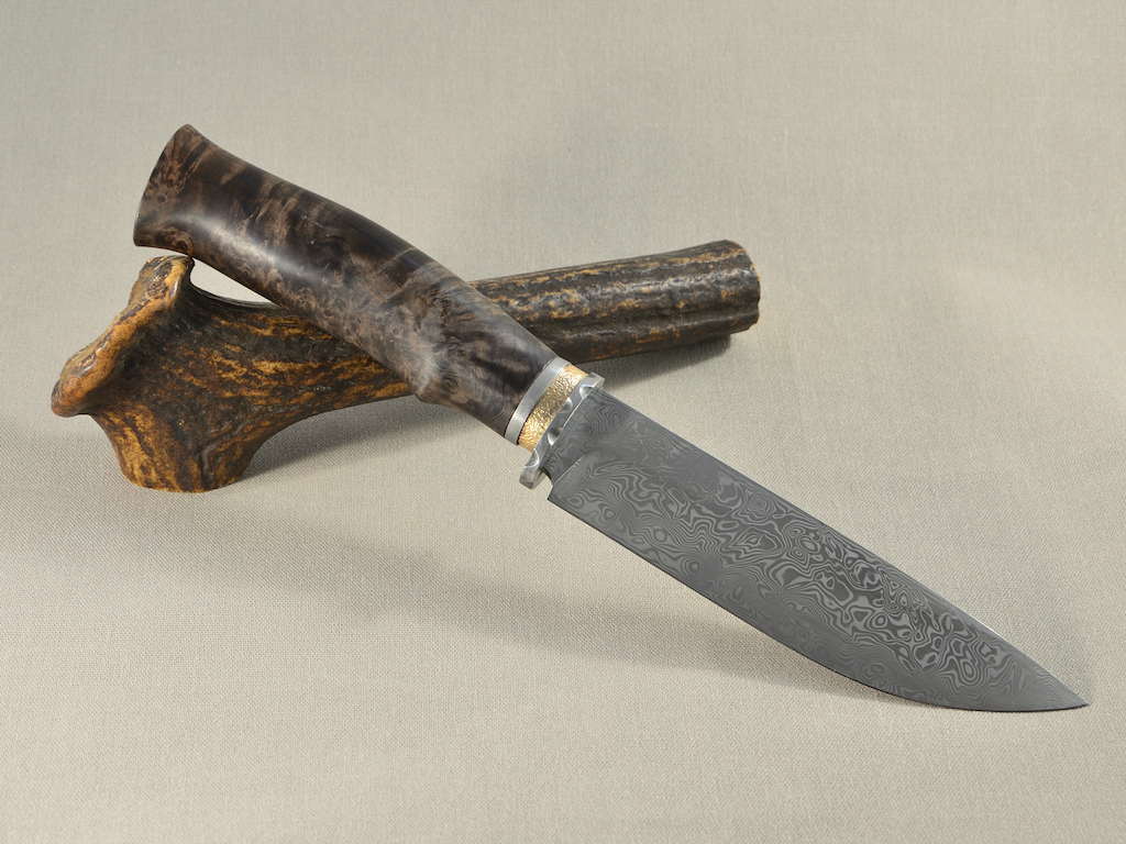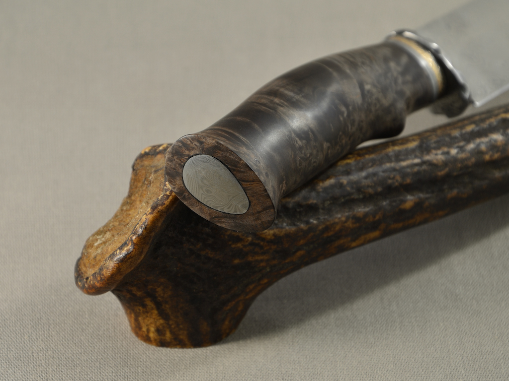 Griff: Stabilisierte Maserbirke grau eingefärbt, Bronze und Damasteel