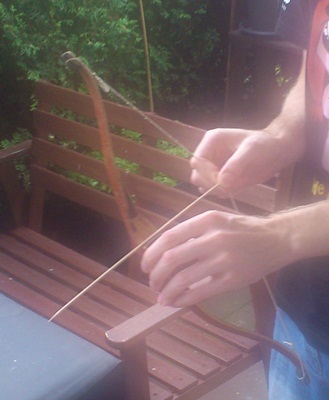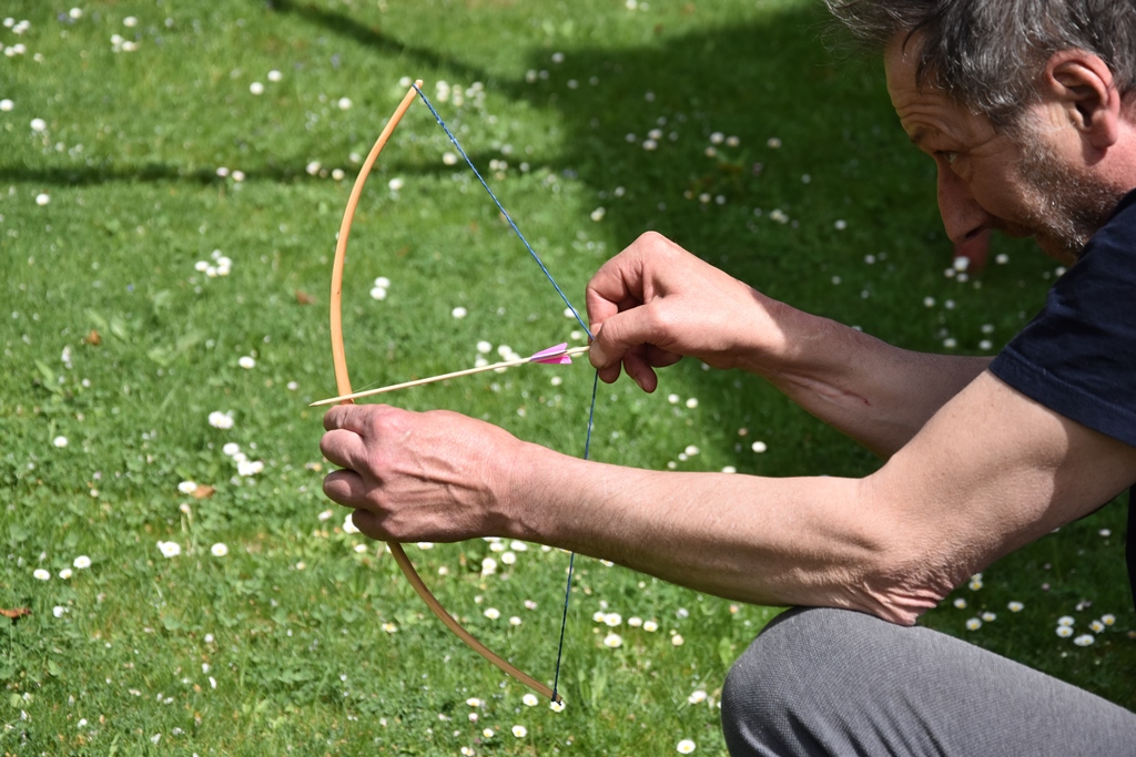 Da hat mich "z Güegi " gestochen, schnell eine Sehne gemacht und aus Schaschlickspiesschen ein paar Pfeile. Das Teil geht ganz schön ab...