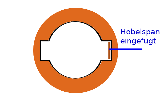 Wird nicht lange halten, schätze ich.Also hab ich dann doch auf die Eule gepfiffen und einen Hobelspan eingesetzt (siehe Bild) und dann den Griff wieder draufgeklopft.