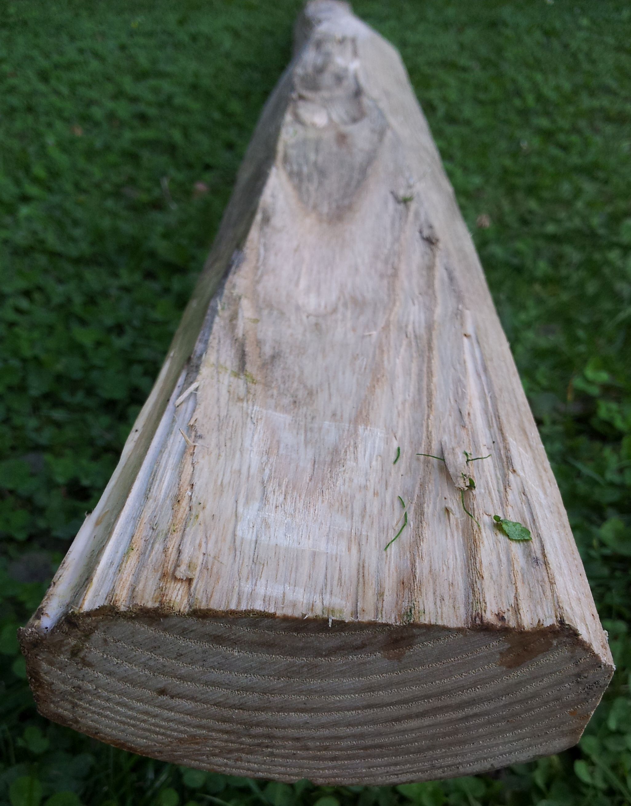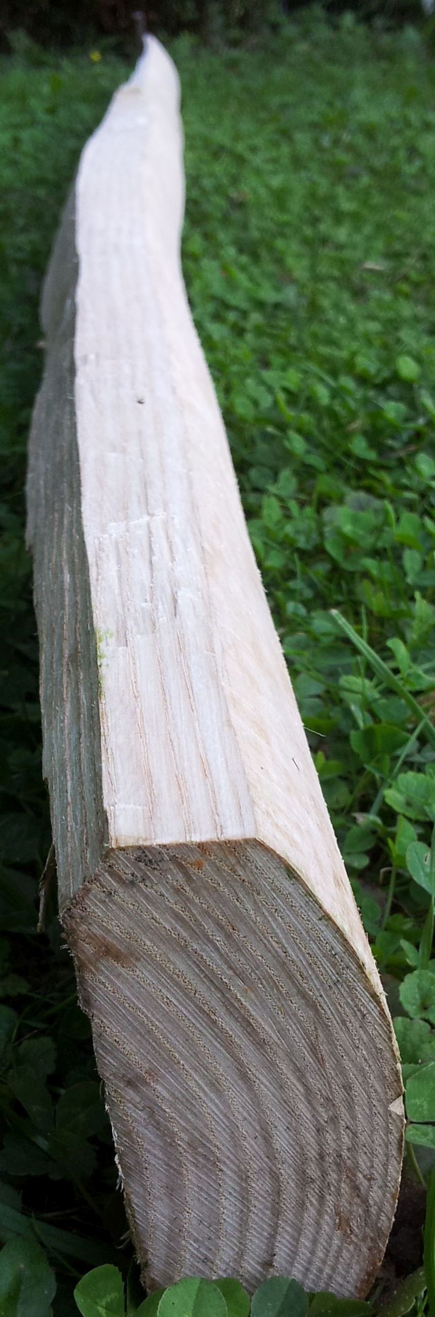 Unsicherheit 2: Die leichte Biegung - besser so lassen wegen des Faserverlaufs oder das Holz "diagonal" so abtragen, dass der Bogen am Schluss kerzengerade wird? In sich verdreht ist das Holz ganz minimal.