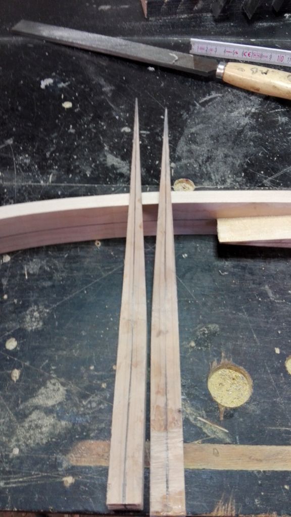 Heute waren die Siyahras mit ihren Spleißen dran.Zuerst wird die Spitze vom dem Spleiß aufgezeichnet und danach mit der Bandsäge ausgeschnitten.Nun können sie plangeschliffen werden und mit hilfen von Klemmen werden sie auf ihre Postion gebracht. Mit einem Bleistift werden die Konturen aufgezeichnet und innen an der Linie vorbei mit der Bandsäge ausgeschnitten.