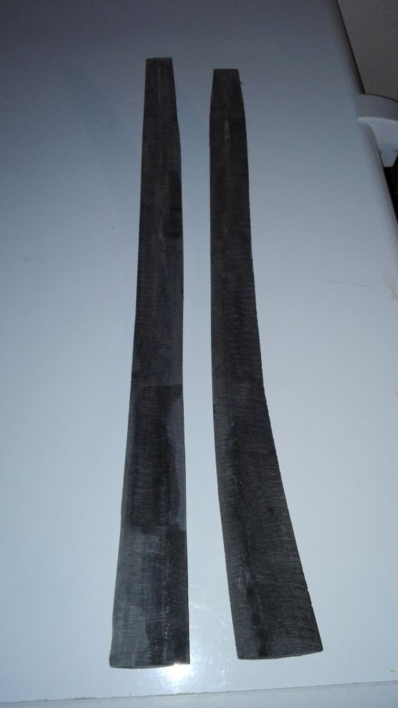 Danach tue ich es mit Wasser bei 150°C in den Backofen 10min. reichen da . Immer wieder gucken wann es weich genug ist. danach zwischen zwei Bretter gepresst und abkühlen lassen und man hat fast gerade Streifen(je nach dicke). Die Hörner haben echt gute Qualität und sind direkt aus China. Keine Risse! Lang genug, fast gerade und keine Verdehung im Horn!!! Das habe ich bisher noch nie gehabt. Auf der linken Seite liegen 2 Streifen die auch aus China sind. So sahen die anderen beiden auch aus, nur nicht so dick. Ich bin die ganze Zeit am überlegen, ob ich die zwei linken Streifen nochmal durchschneiden soll. Die haben eine dicke von 1,2-1,5cm , wenn da faule Stellen drin sind oder mein Bandsäge verläuft habe ich den Salat. Anderenfalls hätte anstatt 2 4 Streifen...
