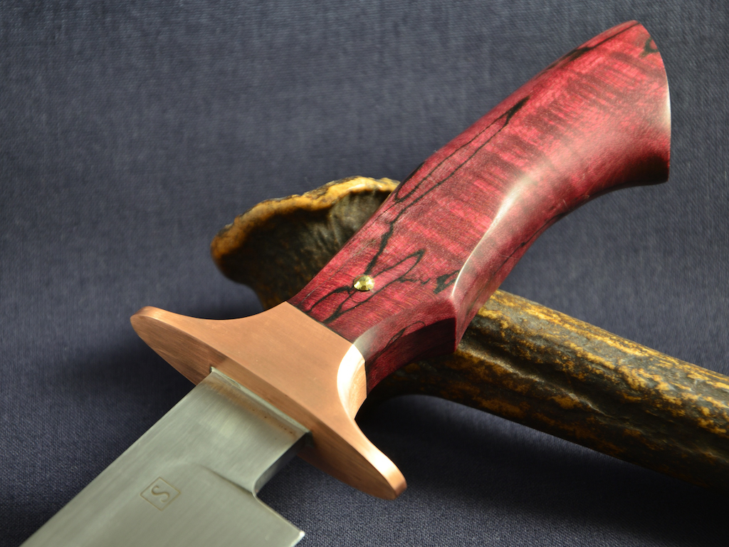 Griff: Stabilisiertes, gestocktes Ahorn, rot eingefärbt und Kupfer für den Handschutz